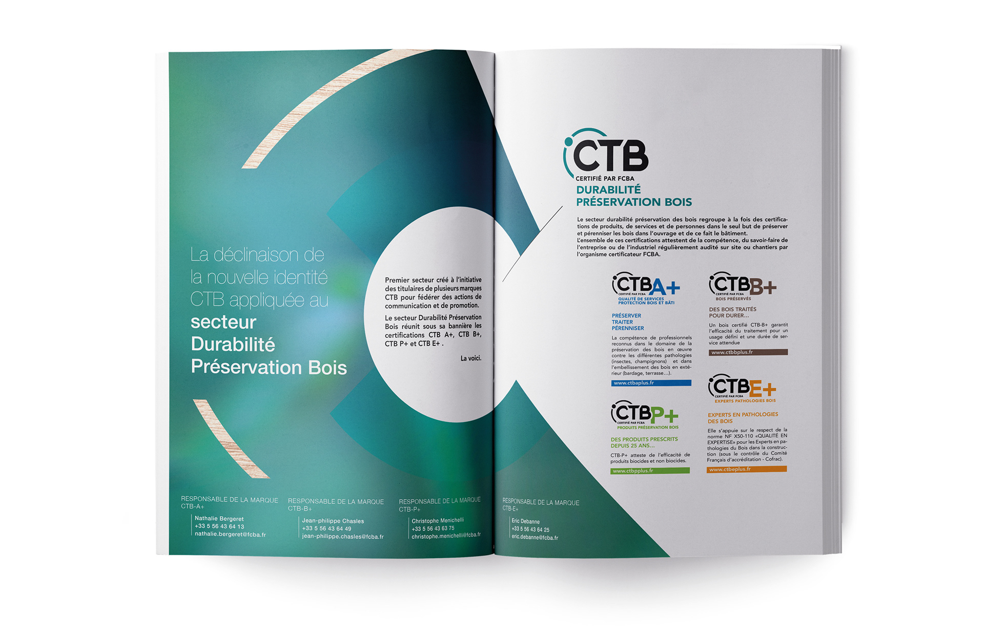 Création du nouveau logo CTB et l'ensemble de ses déclinaisons par secteur : Guides techniques, Fiches techniques, Annonces presse, Habillage salon, Objets promotionnels…